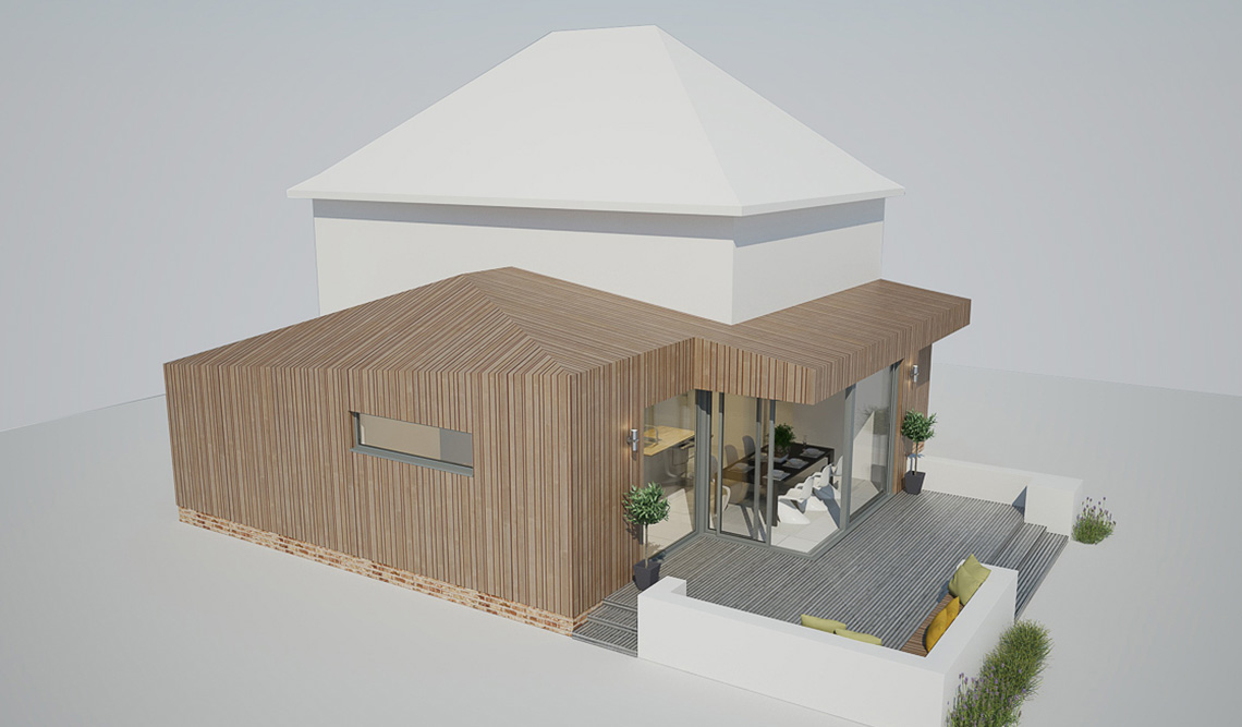 Our brief was to design a very contemporary extension that steps away from the ‘norm’ and adds a really special and unique addition to this 1930’s detached property. The form of the extension provides beautiful vaulted spaces internally, whilst allowing as much natural light as possible to filter through the kitchen and living areas. The careful consideration of the plan allows the internal layout to be open, whilst also clearly defining the kitchen, dining and living space within. The sliding wall between the sitting room and study provides a beautiful feature within the room, whilst allowing the space to be divided and provide an additional bedroom if needed.